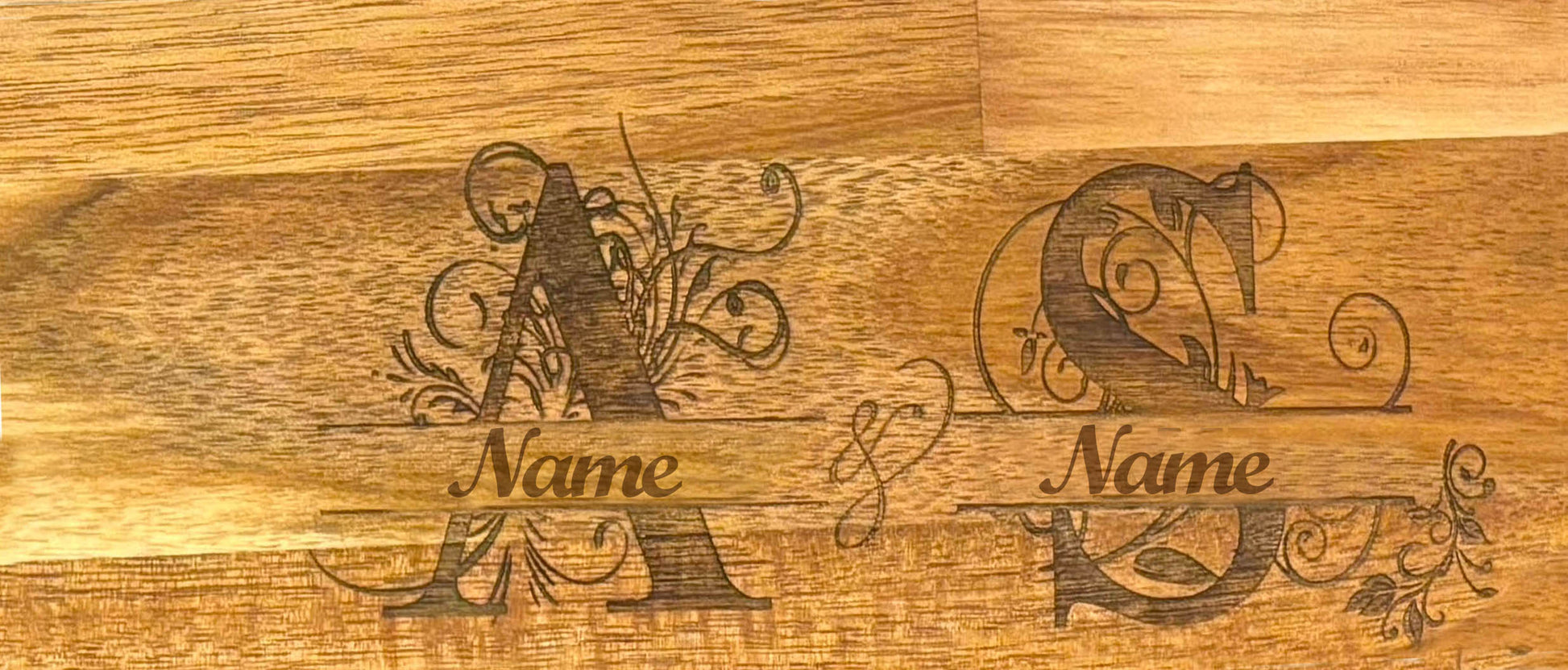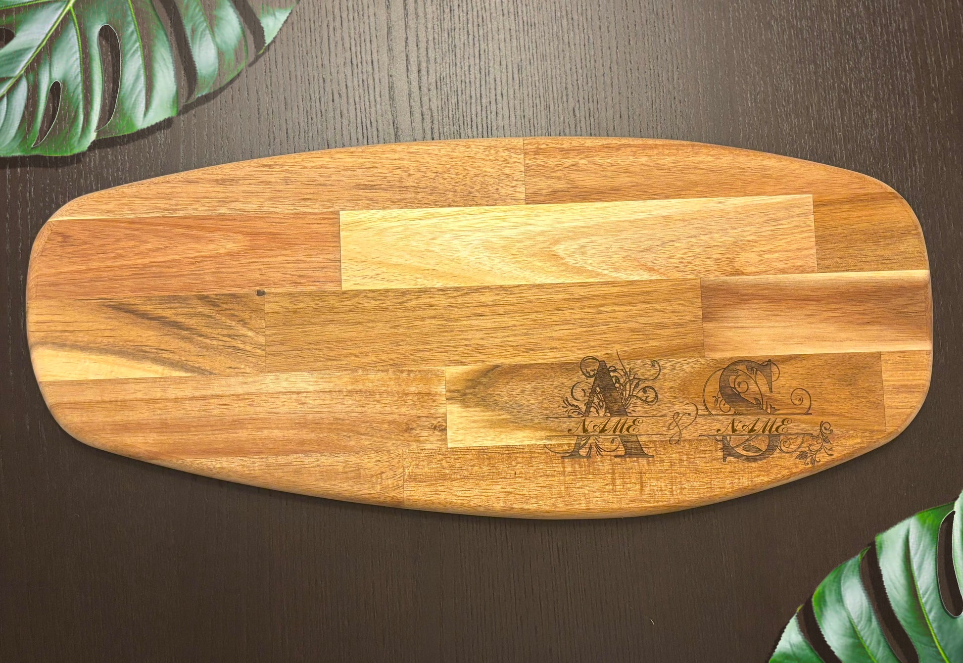 Engraved Acacia wood charcuterie board, perfect for serving cheese or appetizers, adding a unique and stylish touch to your dining table.