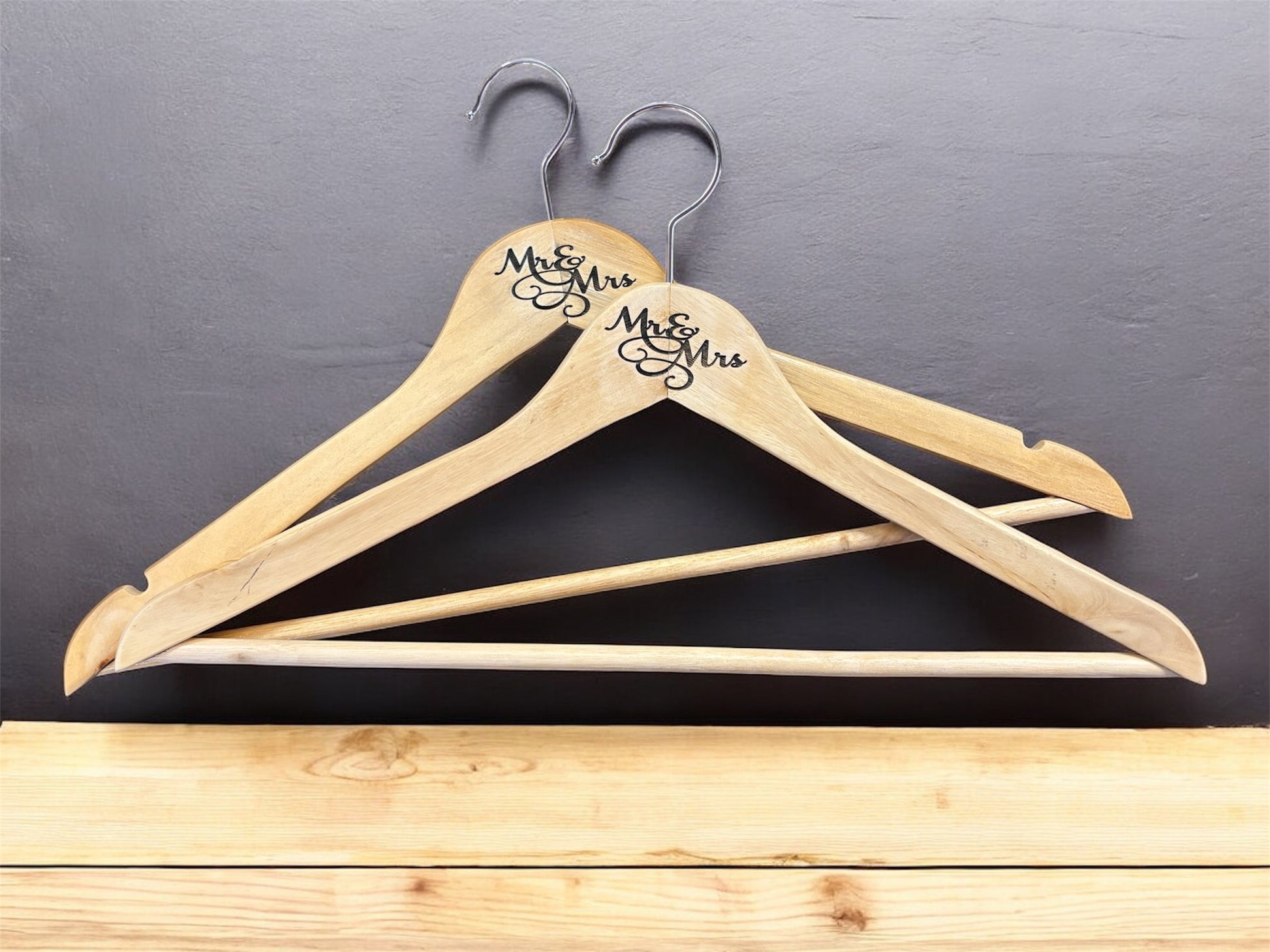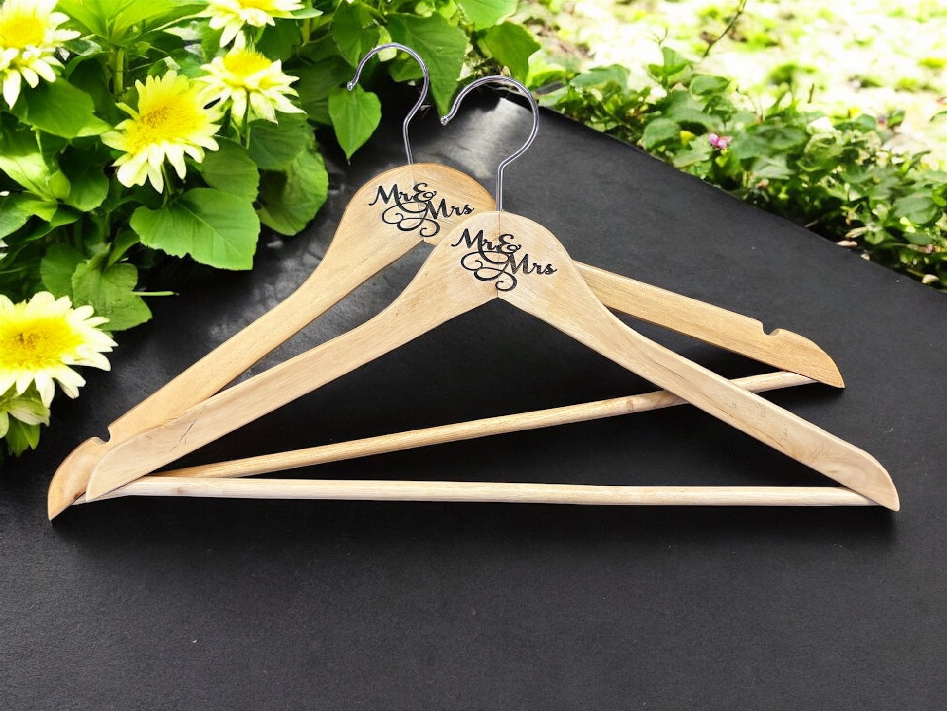 Two wood hangers with engraving on it for newly engaged or married couples.