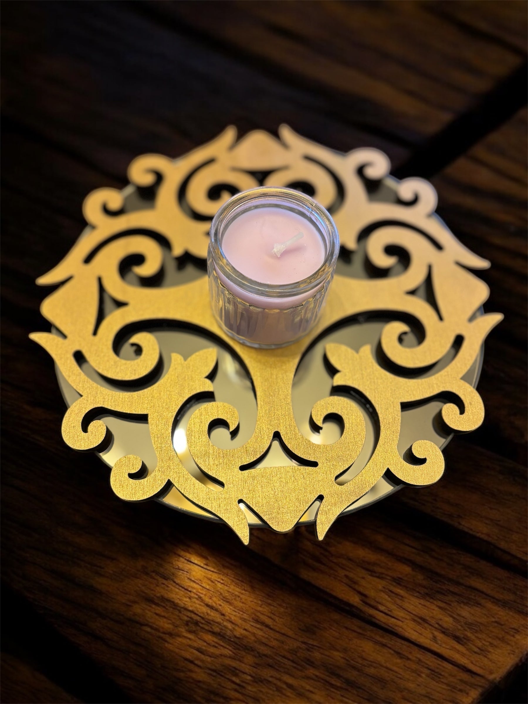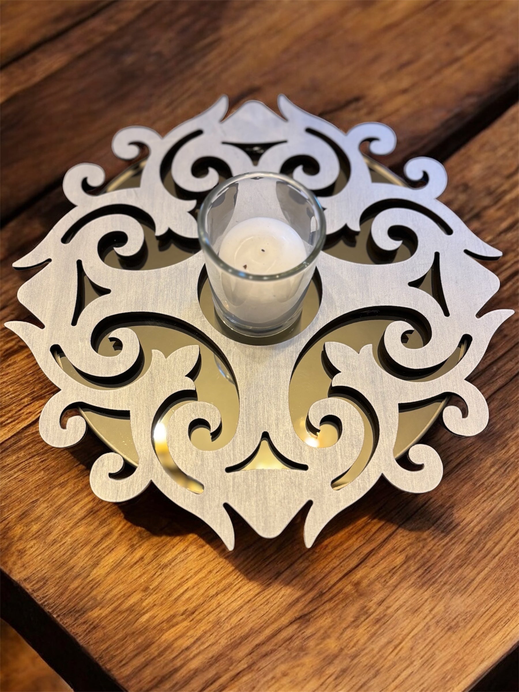 Elegant wood candle holder set on a mirrored base, enhancing the natural beauty of the wood with a touch of sophistication. you can order with customized names on it.
